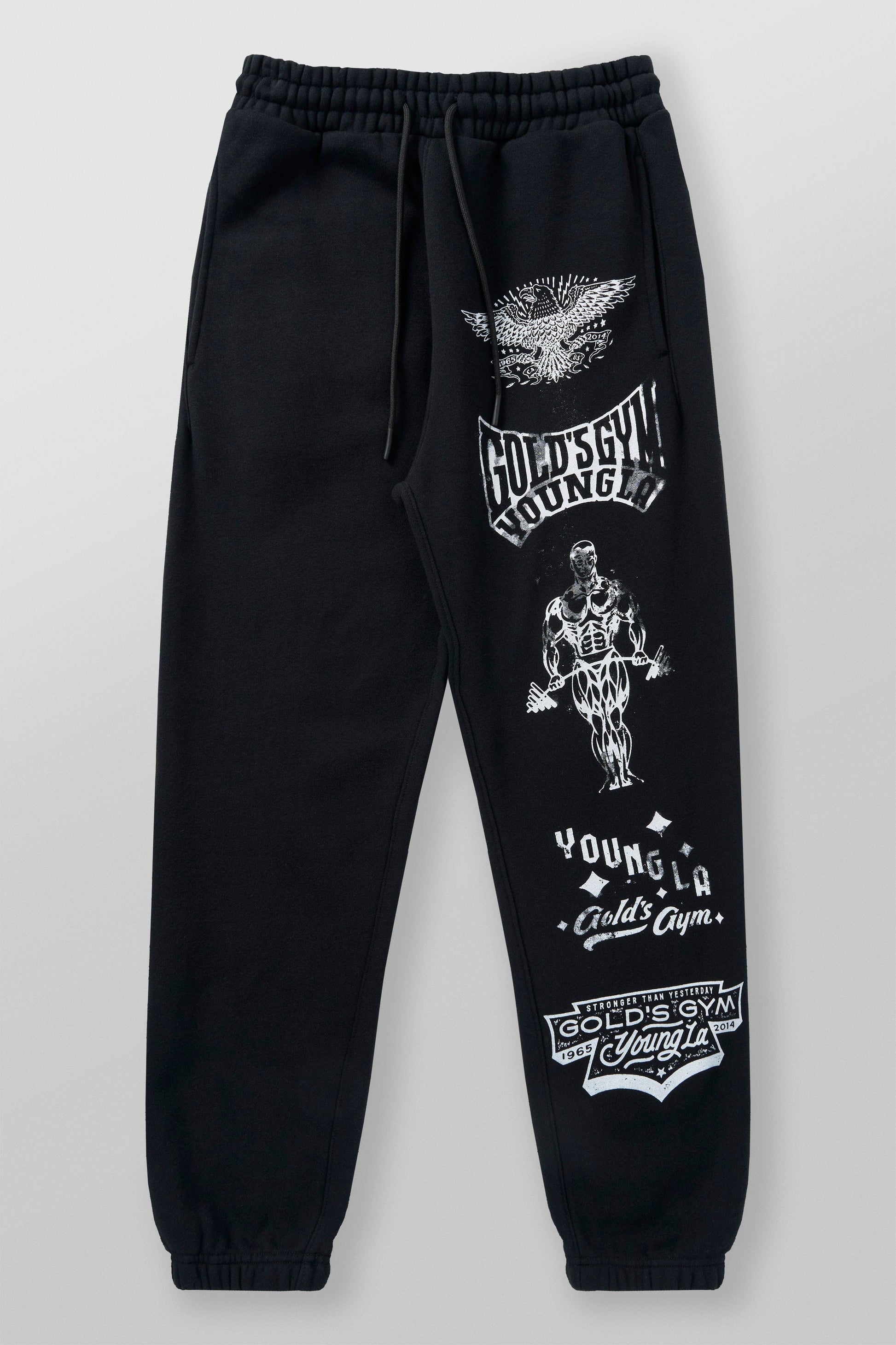 DESIGN: Introducing the Gold’s Gym x YoungLA cuffed joggers – inspired by YoungLA’s best-selling Immortal Joggers. These joggers feature bold printed logos along one leg, blending classic gym heritage with modern streetwear style. Perfect for comfort and style, they bring the iconic look of Gold’s Gym to a versatile everyday piece.