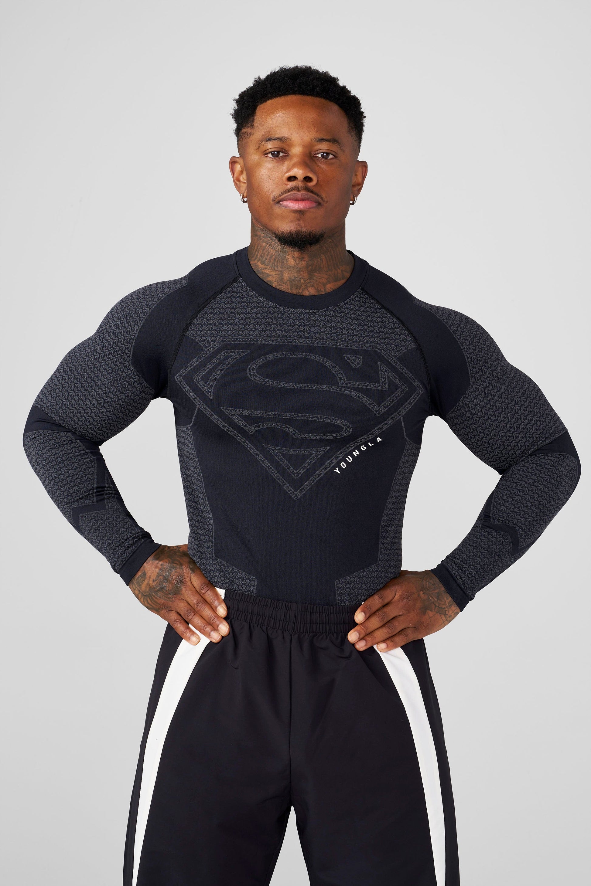 DESIGN: Long sleeve compression top designed to contour the upper body with a second-skin feel. Features full-length sleeves for added coverage, sculpted paneling for a structured look, and bold Superman chest graphic as part of the official YoungLA collaboration with Superman and DC Comics.